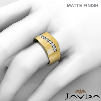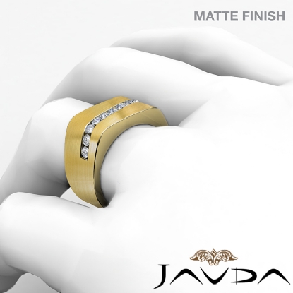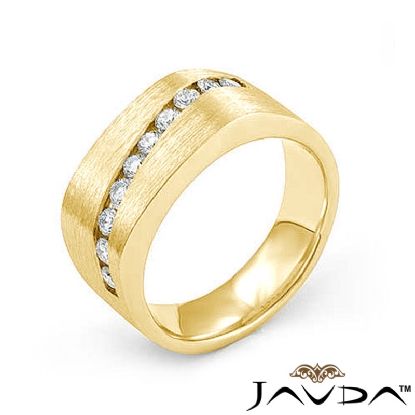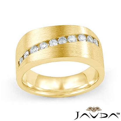 Charming channel set diamond men's half square wedding band is made from 18k Gold Yellow. Featuring matte finish with round diamonds set in a channel setting.