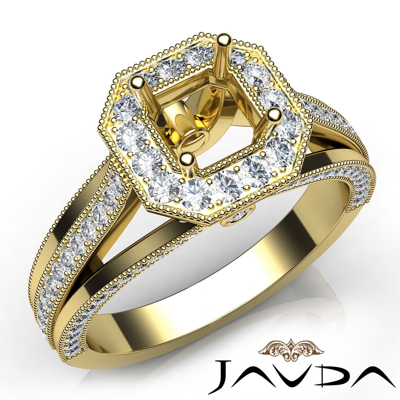 Halo Pave Diamond Engagement Asscher Semi Mount Millgrain Ring 18k Gold (0.9Ct. tw.)