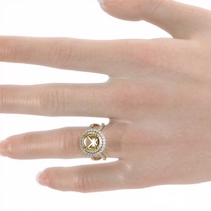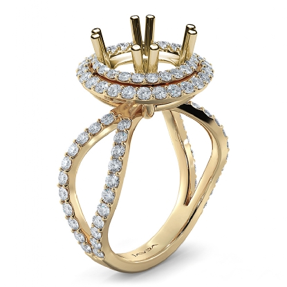 Alluring in every way, this intricate 14k Gold Yellow engagement ring has a round semi mount. It features . Diamonds in 2 row halo pave set & on the split shank, round diamonds dazzling on each side of the ring. It Weight 5.4 gram (0.9Ct. tw.)