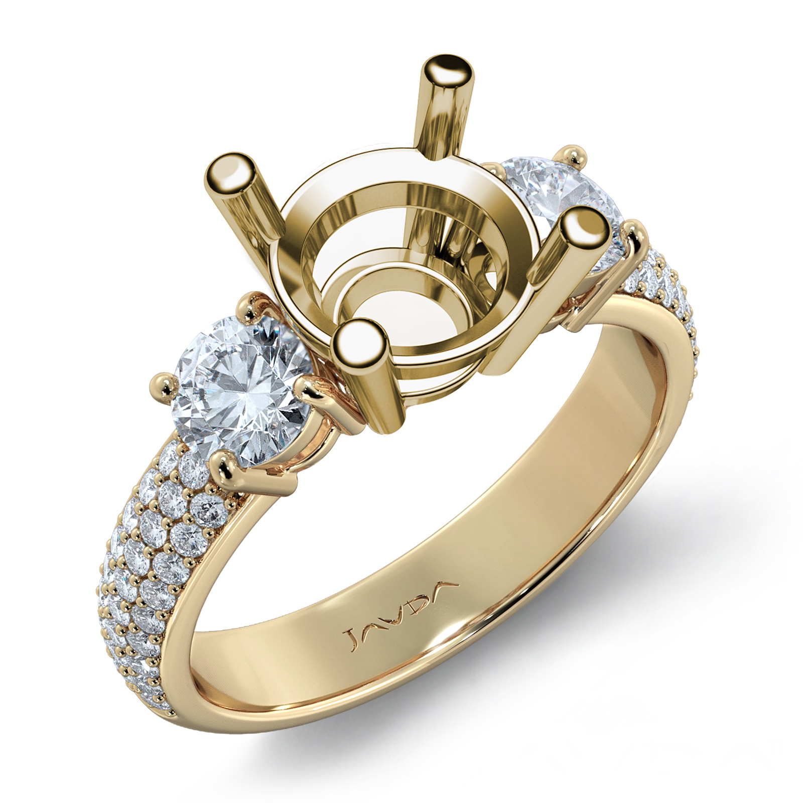 Eyes will be fixated on this one! This 3 stone round semi mount diamond engagement ring is made in 18k Gold Yellow. It showcases . round prong diamonds in prong, pave & along the sparkling shank. It weights 4.4 gram. (0.9Ct. tw.)