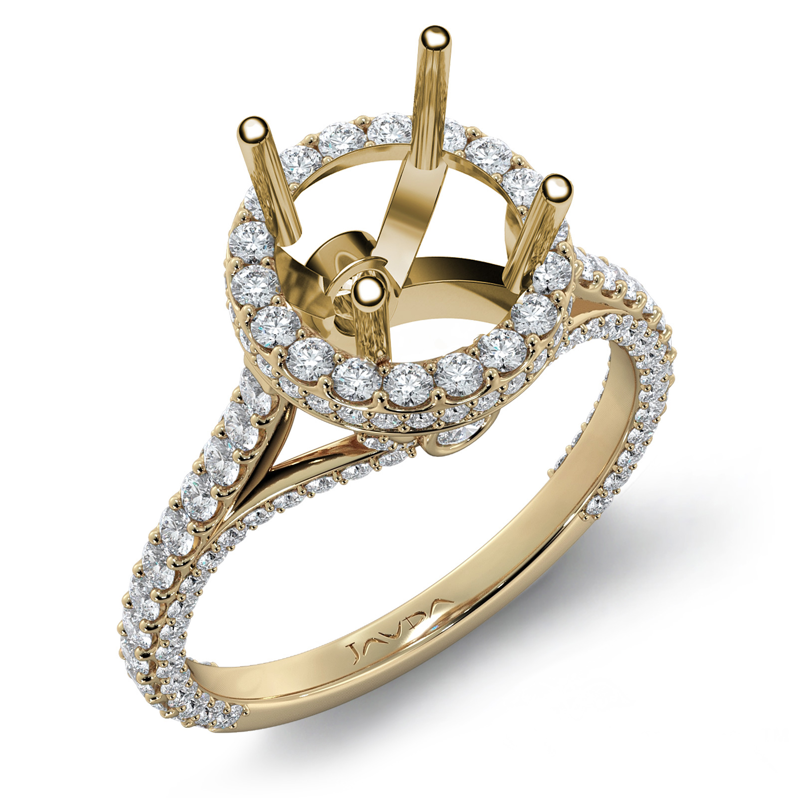 This beautiful diamond engagement ring made in 18k Gold Yellow. This round semi mount ring features . Halo U shape cut round diamonds dazzling in halo & the shank. It weights 4.1 grams. (1.3Ct. tw.)
