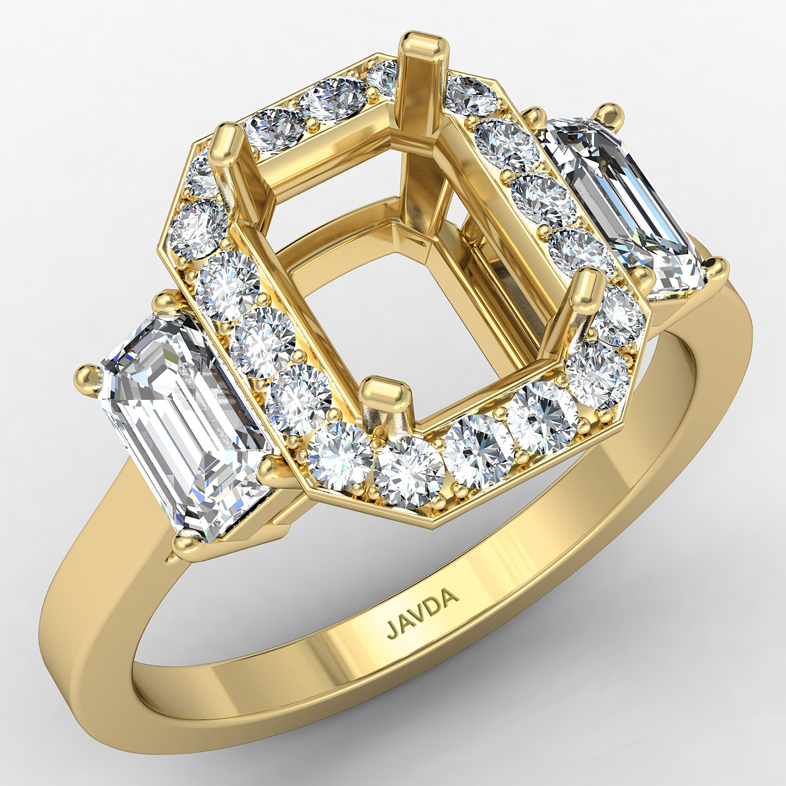 3 Stone Halo Diamond Engagement Emerald Semi Mount 14k Gold Ring (0.78Ct. tw.)