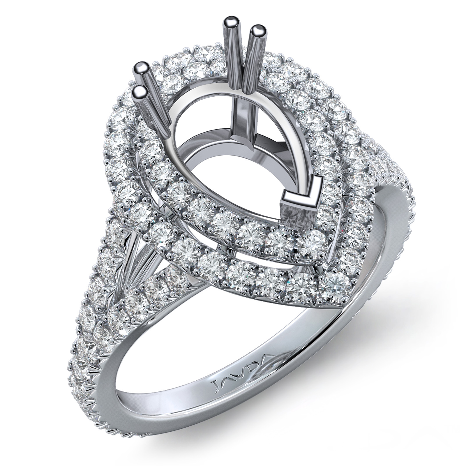 This Magnificent diamond engagement ring is made in glorious 18k Gold White. This pear cut semi mount ring features . round diamonds in French V Cut Pave setting on double halo & on the split shank shank. It weights 6 grams (1.3Ct. tw.)
