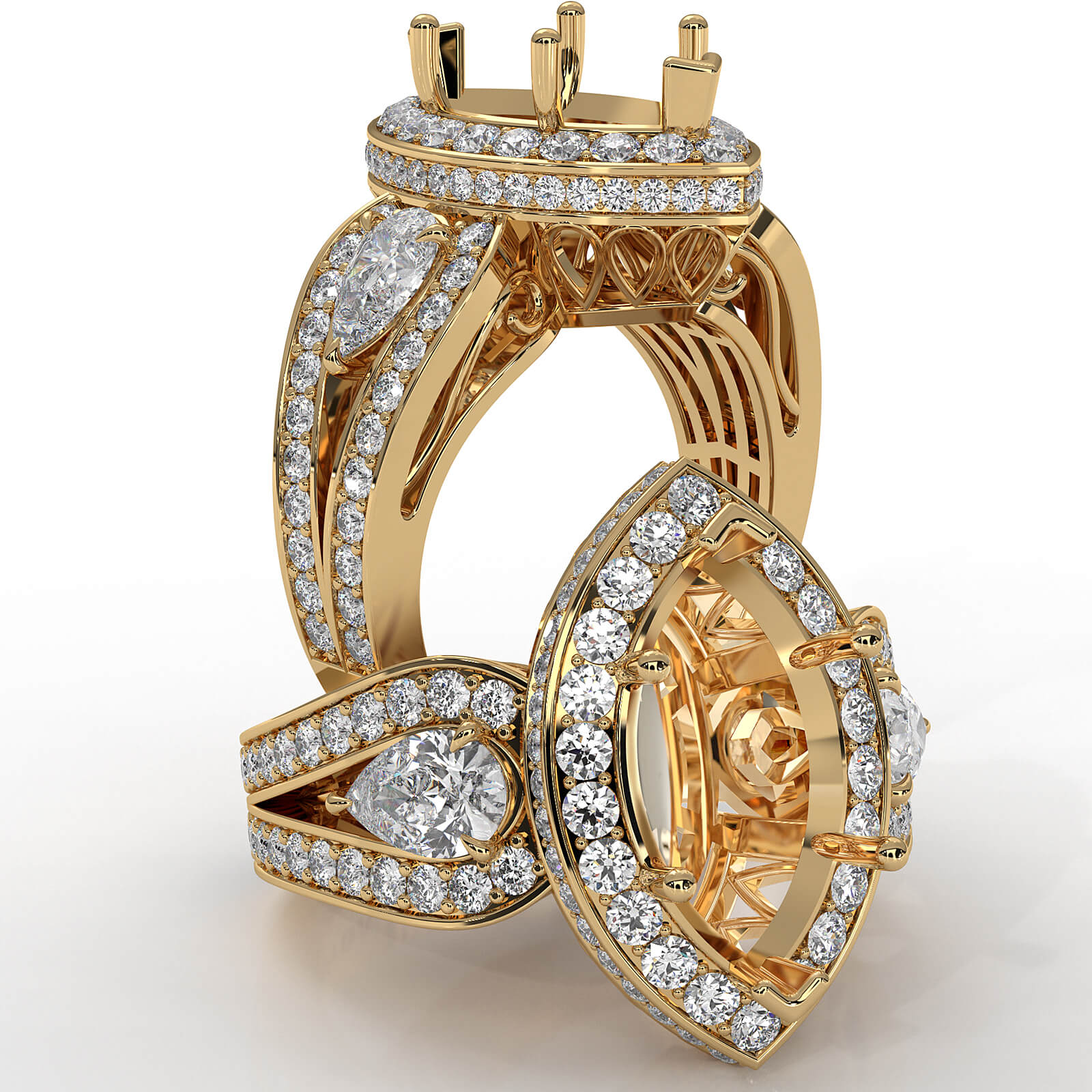 Capture the moment with this 18k Gold Yellow 3 stone engagement ring, featuring a marquise semi-mount halo of round diamonds. It showcases of total round diamonds &
