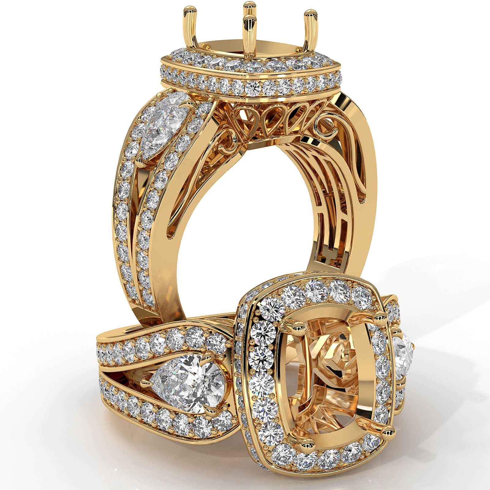 Capture the moment with this 18k Gold Yellow 3 stone engagement ring, featuring a cushion semi-mount halo of round diamonds. It showcases of total round diamonds &