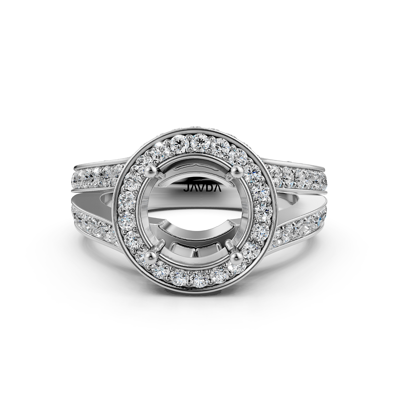 Made in 18k Gold White & unique in design, this . women's diamond engagement ring showcases a round semi-mount halo of round pave-set diamonds, along with split shank setting on the shank. (1.15Ct. tw.)