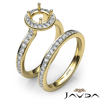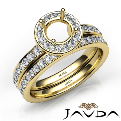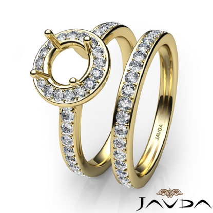 Inspired by Classic design, this . bridal set consists of a round semi mount engagement ring and a matching band, featuring round pave set diamonds in halo and shank. This beautiful set is made in enduring 14k Gold Yellow. (0.95Ct. tw.)