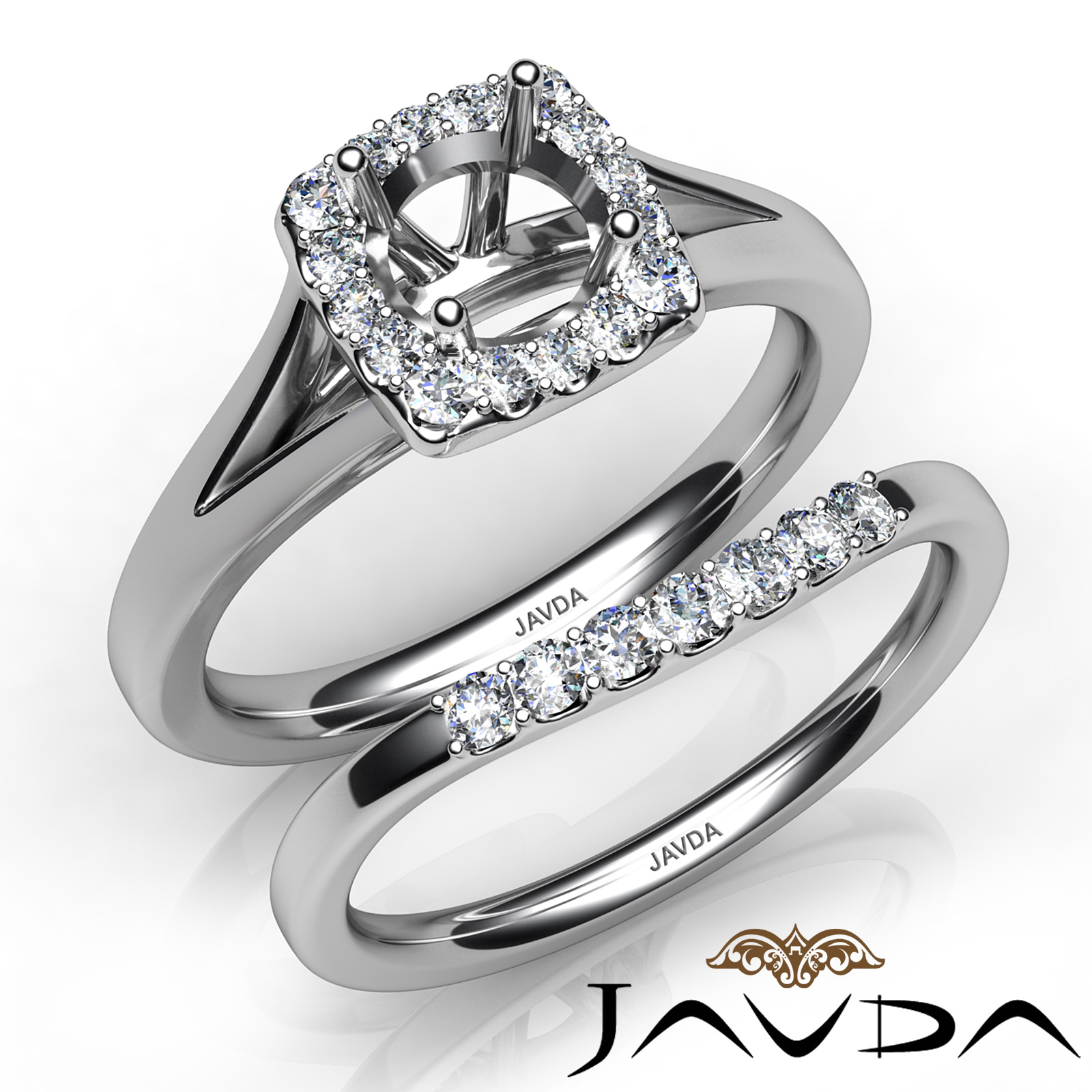 This Elegant & Beautiful . bridal set is such a stunner! It consists of a round semi mount engagement ring and a matching band, featuring U Cut Prong set diamonds on halo and the shank. This beautiful diamond set is made in 18k Gold White. (0.42Ct. tw.)