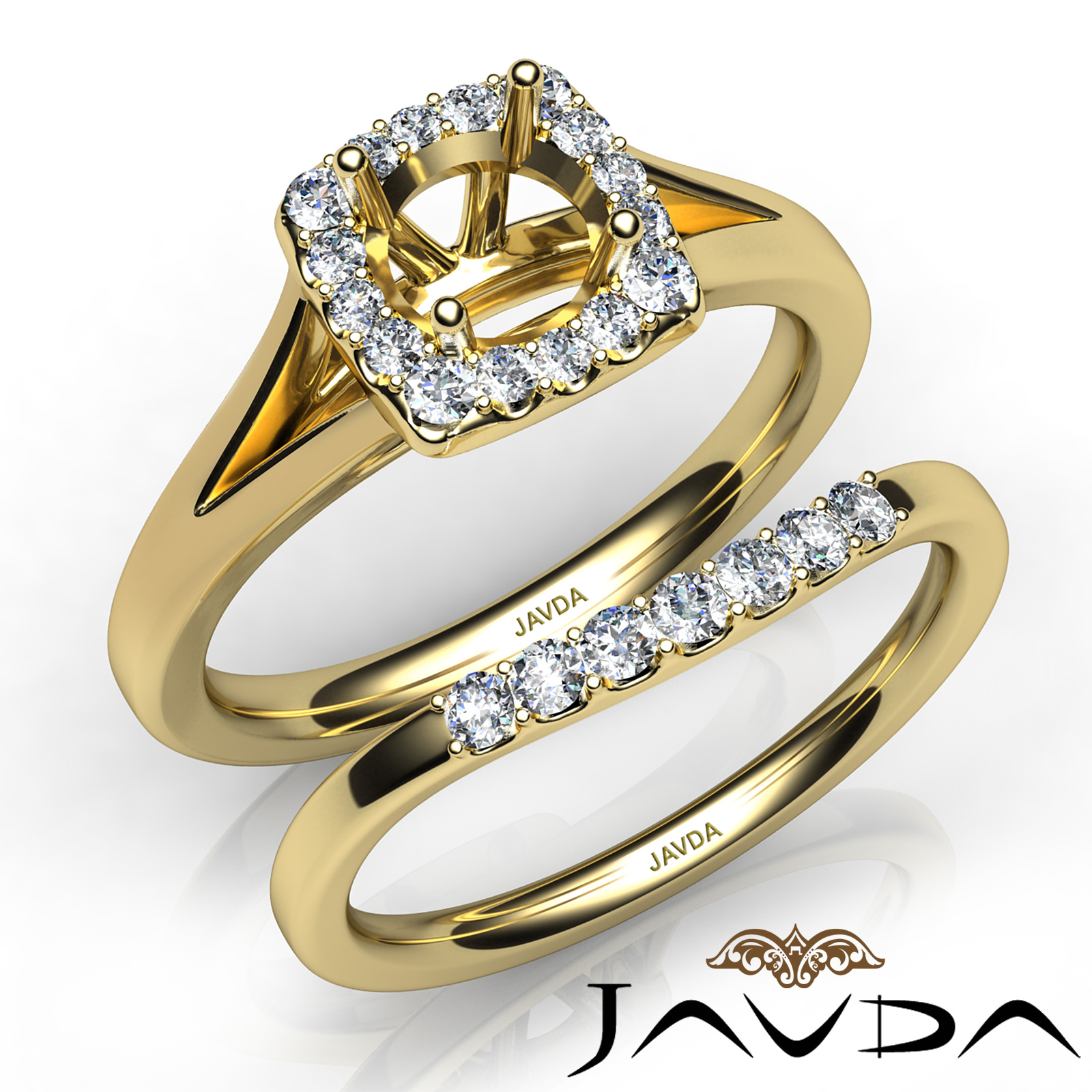 This Elegant & Beautiful . bridal set is such a stunner! It consists of a round semi mount engagement ring and a matching band, featuring U Cut Prong set diamonds on halo and the shank. This beautiful diamond set is made in 18k Gold Yellow. (0.42Ct. tw.)