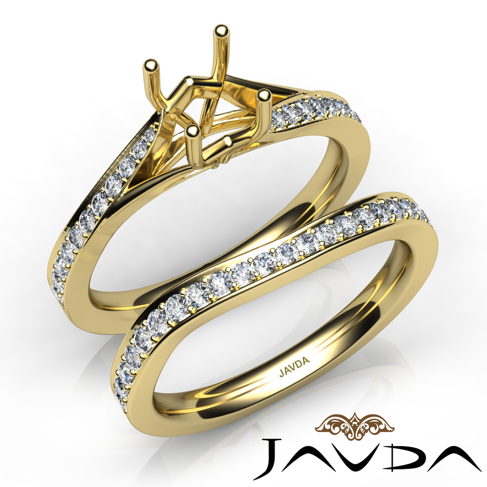 Truly extraordinary, this engagement ring and matching band feature round semi mount in pave setting and round pave set diamonds on the shank. This . bridal set is made in 14k Gold Yellow. (0.9Ct. tw.)