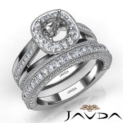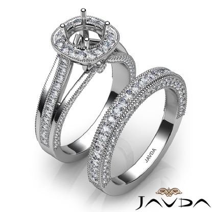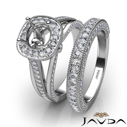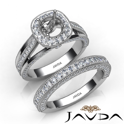 Classic in design, this round cut semi mount engagement milgrain ring and women's wedding band features round halo pave set diamonds in halo and along the pretty shank. This . bridal set is crafted in 18k Gold White. (1.7Ct. tw.)