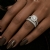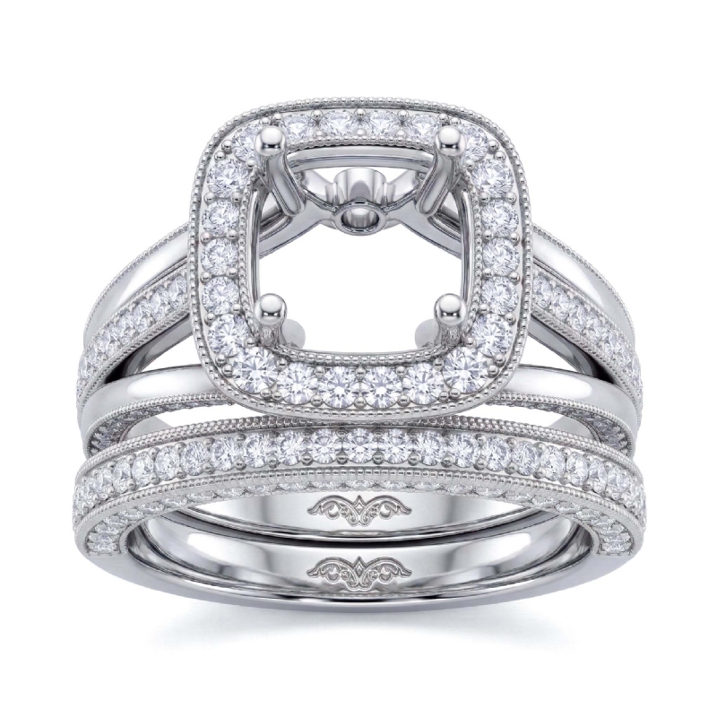 Classic in design, this round cut semi mount engagement milgrain ring and women's wedding band features round halo pave set diamonds in halo and along the pretty shank. This . bridal set is crafted in Platinum 950. (1.7Ct. tw.)