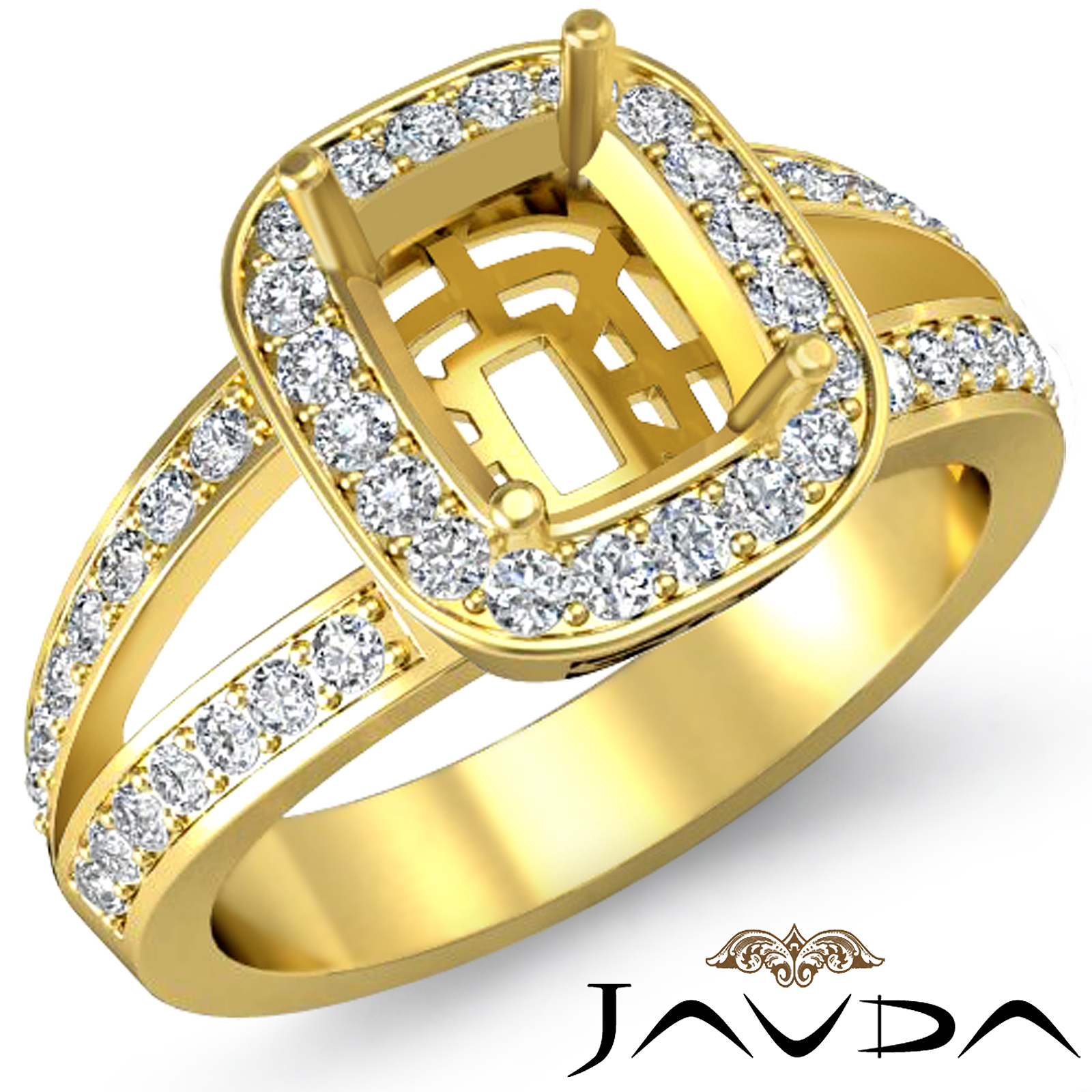Love in all its brilliance, this diamond engagement ring is made in enduring 18k Gold Yellow. It has a cushion semi mount & features pave set round diamonds in halo & along the split shank. (0.55Ct. tw.)