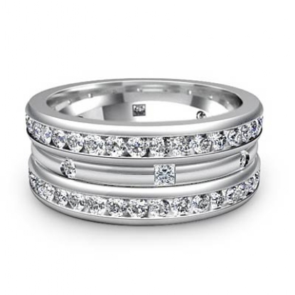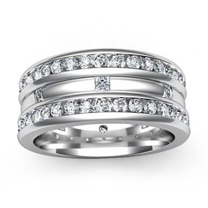 A magnificent princess & round diamond men's eternity wedding band is crafted in 18k Gold White. This polished finish wedding ring features princess diamonds in a bezel setting and