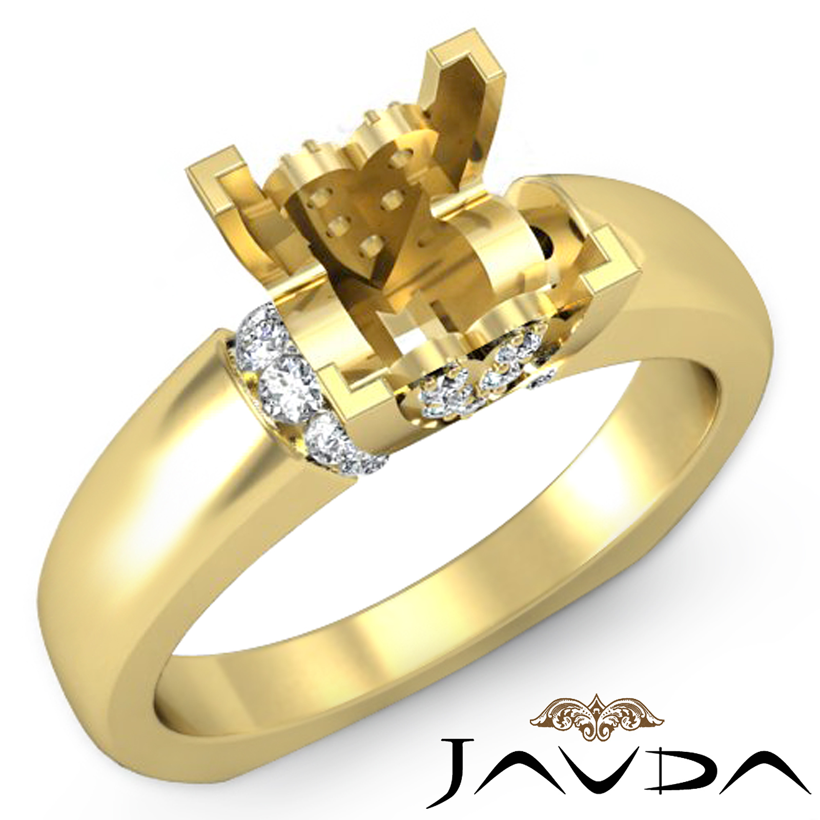 Intricately crafted, this diamond engagement ring is made in lustrous 18k Gold Yellow. It features a princess semi mount, with pave set round diamond uniquely set on the shank. (0.35Ct. tw.)