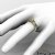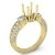 An arrangement of diamonds surrounds the semi mount round center stone with round diamonds in prong setting on the sides. The