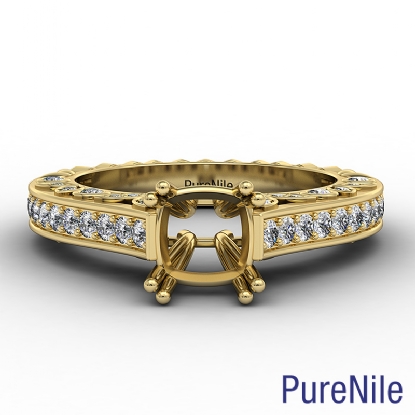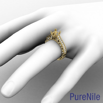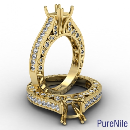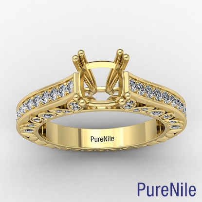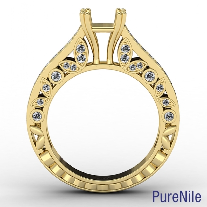 Delicate floral petal cushion diamond engagement ring made in high quality 14k Gold Yellow. This designer diamond ring features cushion cut semi mount with side diamonds in a beautiful floral petal pave and bezel setting. Available in white gold, yellow gold, rose gold and platinum. (0.5Ct. tw.)