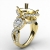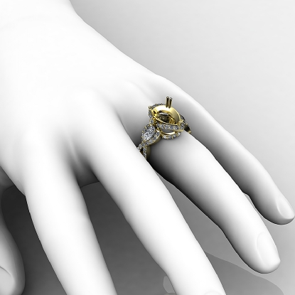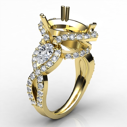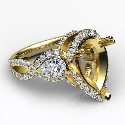 This semi mount blooming beauty features three pear shaped stones for a glamorous engagement ring. of round diamonds along the halo & shank, surround the