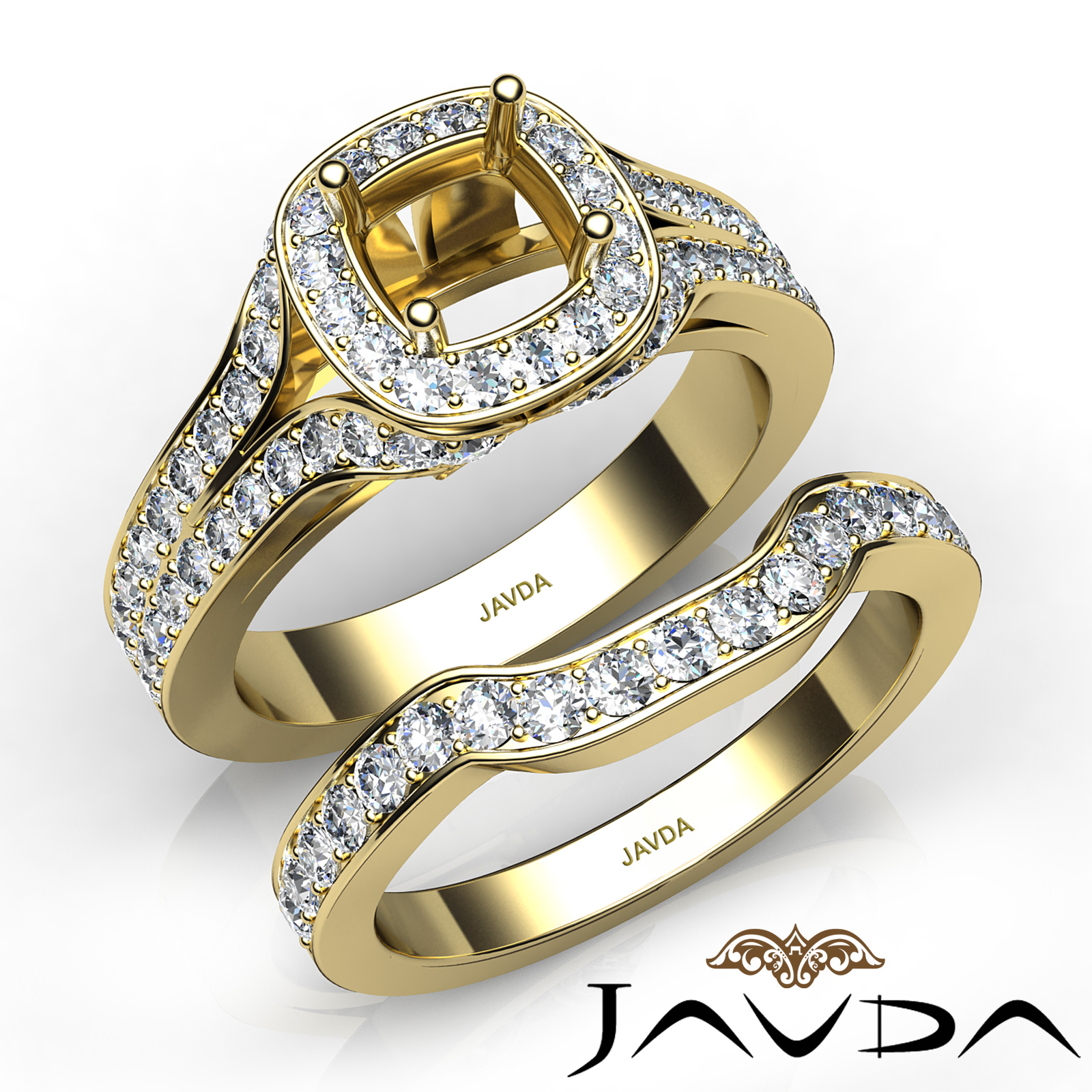 Exquisite! This round semi mount bridal set made in 14k Gold Yellow, comes with an engagement ring and matching band. It features . of round pave set diamonds in a beautiful Halo Pave Split shank. (1.9Ct. tw.)