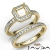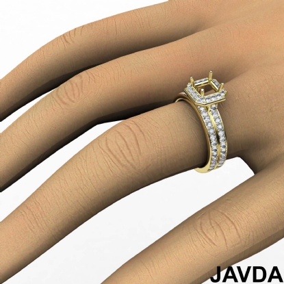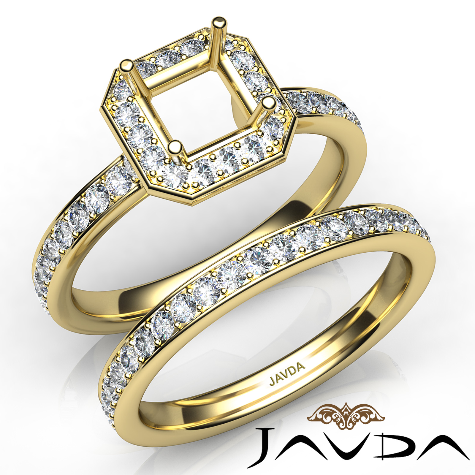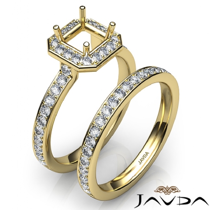 Capture your lasting love with this Asscher semi mount engagement ring and matching band that features round diamonds in halo along the shank. This bridal set is made in 18k Gold Yellow. (0.95Ct. tw.)