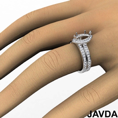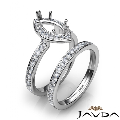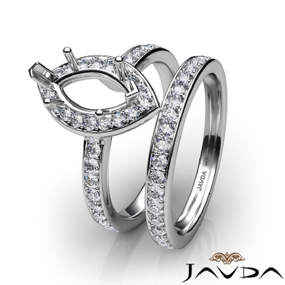 Capture your lasting love with this Marquise semi mount engagement ring and matching band that features round diamonds in halo along the shank. This bridal set is made in 18k Gold White. (0.95Ct. tw.)