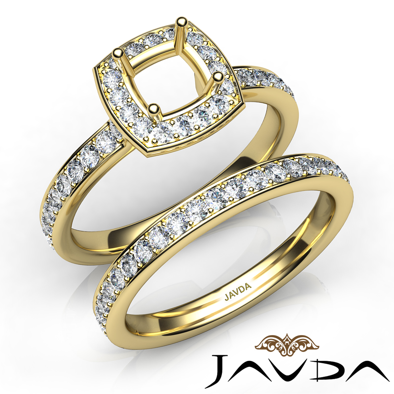 Capture your lasting love with this Cushion Cut semi mount engagement ring and matching band that features round diamonds in halo along the shank. This bridal set is made in 14k Gold Yellow. (0.95Ct. tw.)