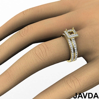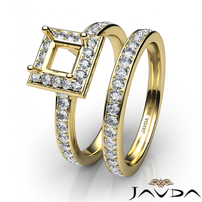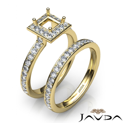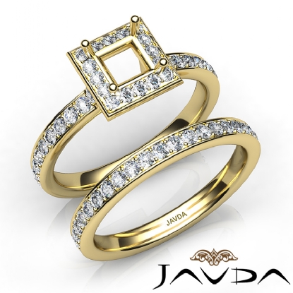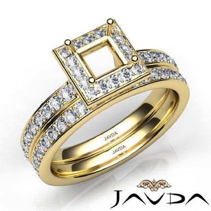 Capture your lasting love with this Princess Cut semi mount engagement ring and matching band that features round diamonds in halo along the shank. This bridal set is made in 14k Gold Yellow. (0.95Ct. tw.)