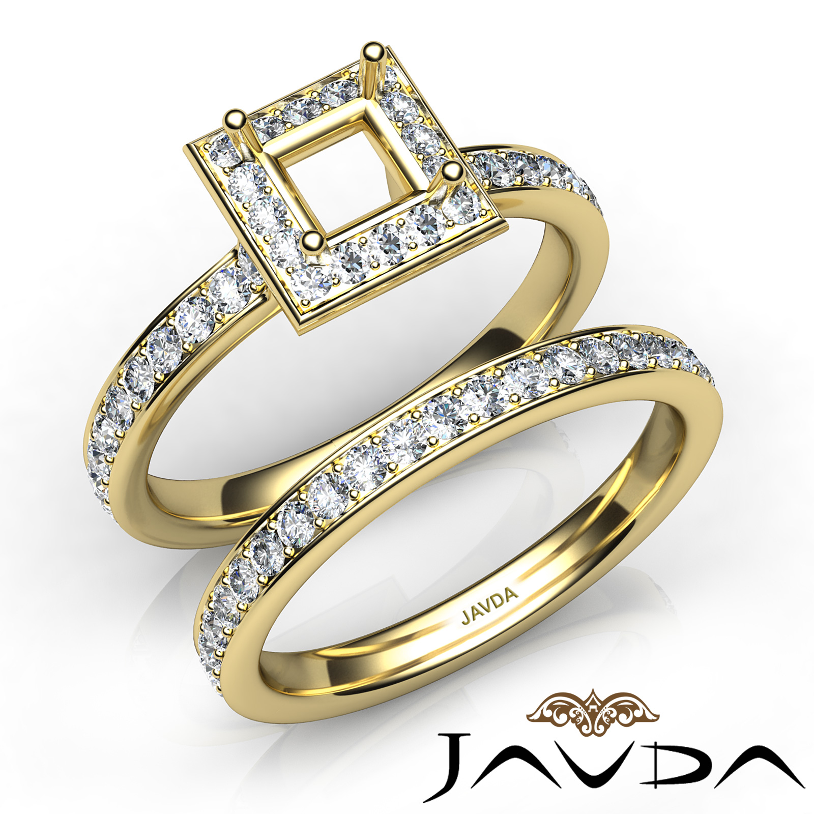 Capture your lasting love with this Princess Cut semi mount engagement ring and matching band that features round diamonds in halo along the shank. This bridal set is made in 18k Gold Yellow. (0.95Ct. tw.)
