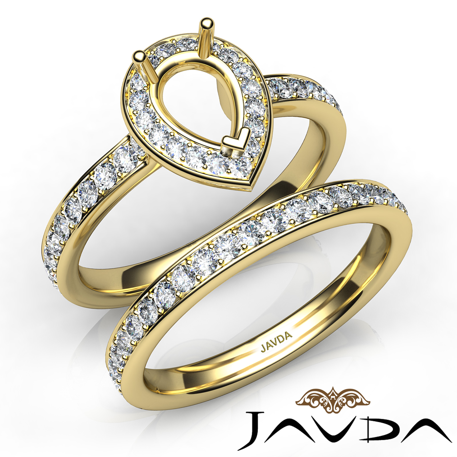 Capture your lasting love with this Pear Cut semi mount engagement ring and matching band that features round diamonds in halo along the shank. This bridal set is made in 14k Gold Yellow. (0.95Ct. tw.)
