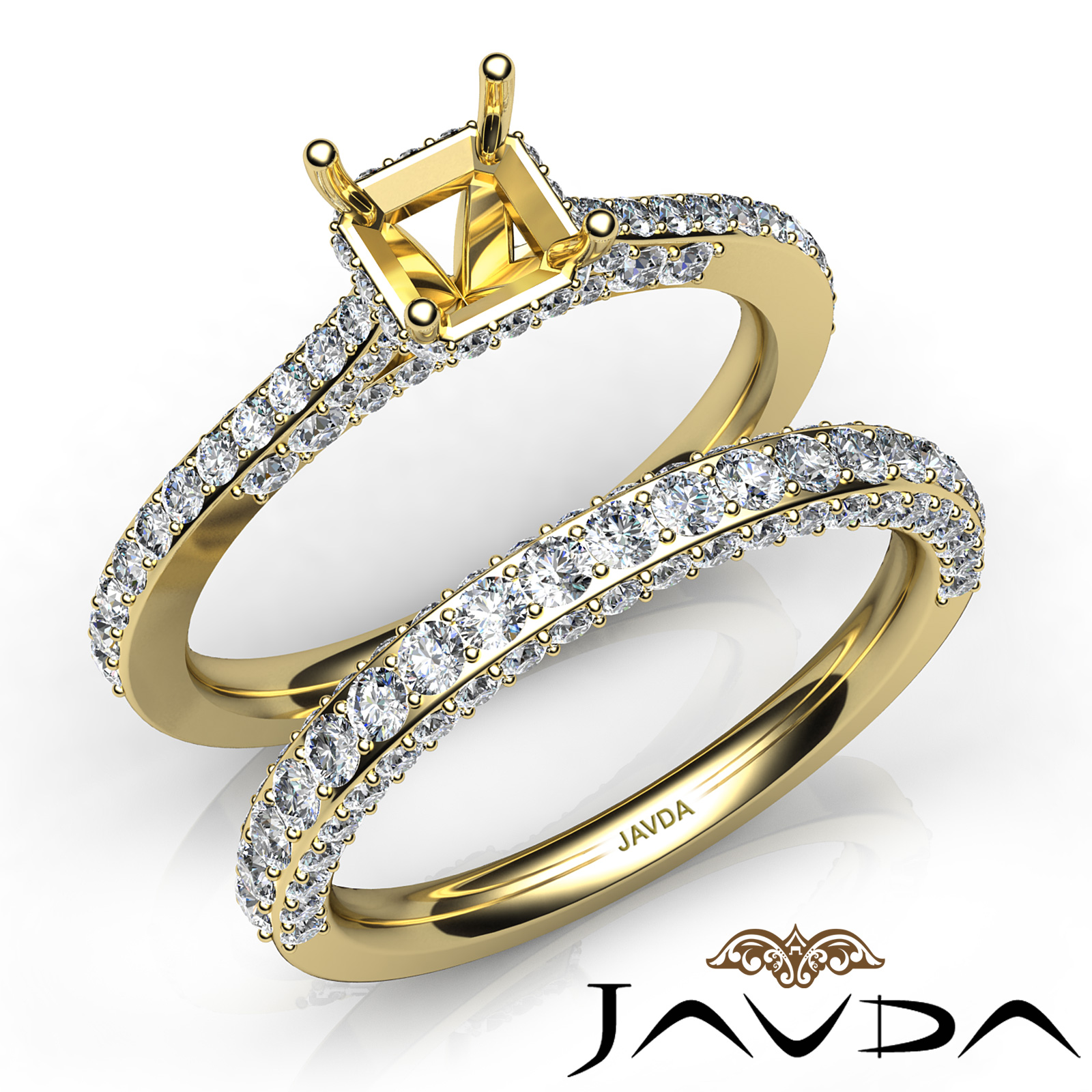 Elegant in any way, this asscher semi mount engagement ring and bridal set feature . round pave set diamonds along the shank. The bridal set is made in 18k Gold Yellow. (1.65Ct. tw.)