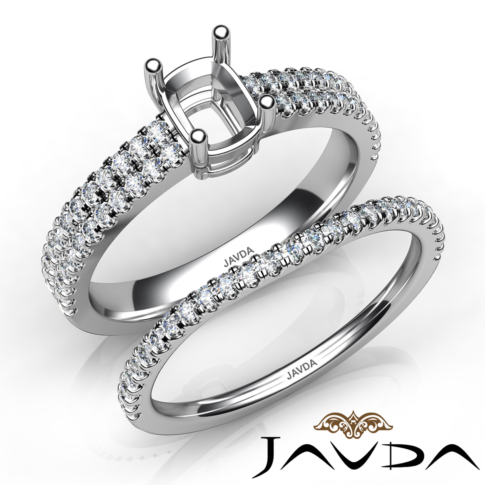 Breathtaking in design, this Platinum 950 cushion semi mount engagement ring comes with a matching band. It features . round U Split Cut Prong set diamonds in shank. This bridal set will be the perfect choice. (0.8Ct. tw.)