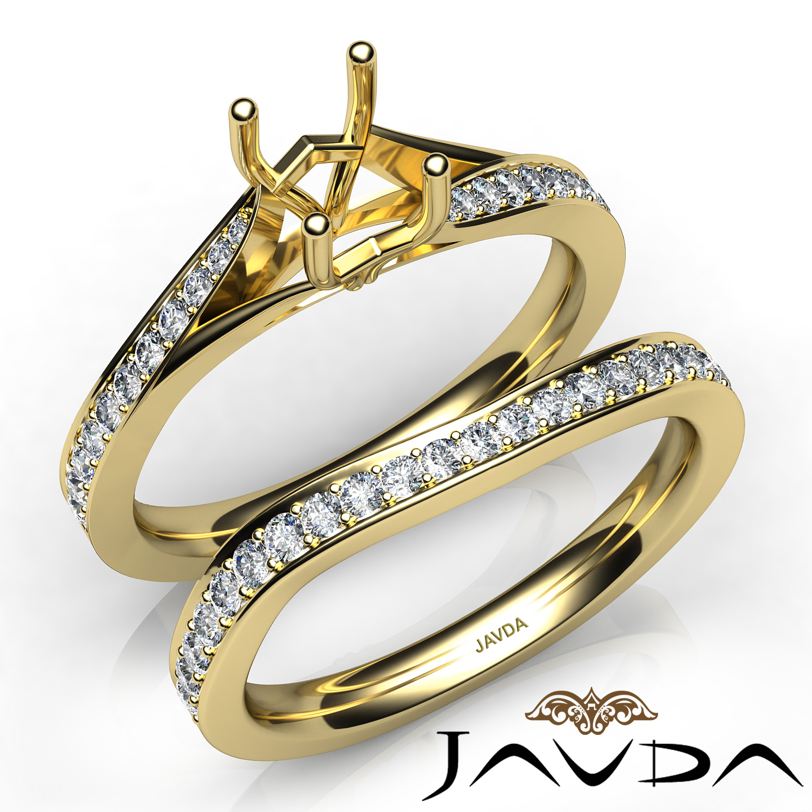 Truly extraordinary, this engagement ring and matching band feature cushion cut semi mount in pave setting and round pave set diamonds on the shank. This . bridal set is made in 14k Gold Yellow. (0.9Ct. tw.)