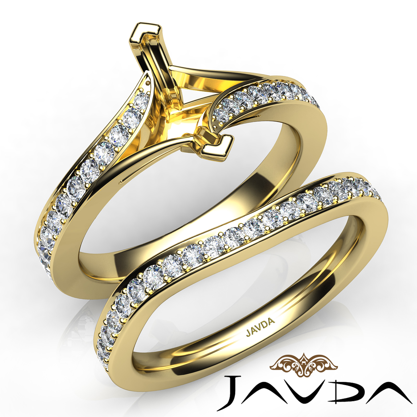 Truly extraordinary, this engagement ring and matching band feature marquise semi mount in pave setting and round pave set diamonds on the shank. This . bridal set is made in 18k Gold Yellow. (0.9Ct. tw.)