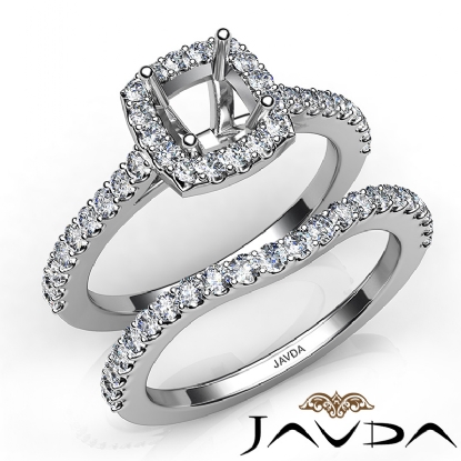 Create a breathtaking moment with this cushion cur semi mount . bridal set, showcasing a diamond-laden shank and halo in U prong setting, with a matching band. This engagement ring is framed against enduring 18k Gold White. (1Ct. tw.)