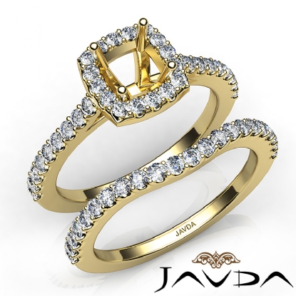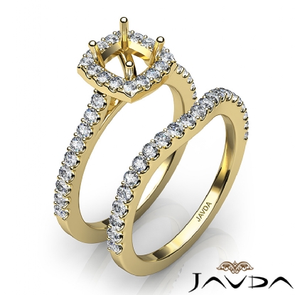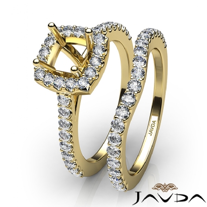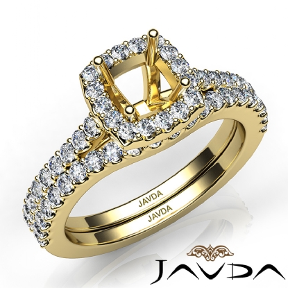 Create a breathtaking moment with this cushion cur semi mount . bridal set, showcasing a diamond-laden shank and halo in U prong setting, with a matching band. This engagement ring is framed against enduring 18k Gold Yellow. (1Ct. tw.)