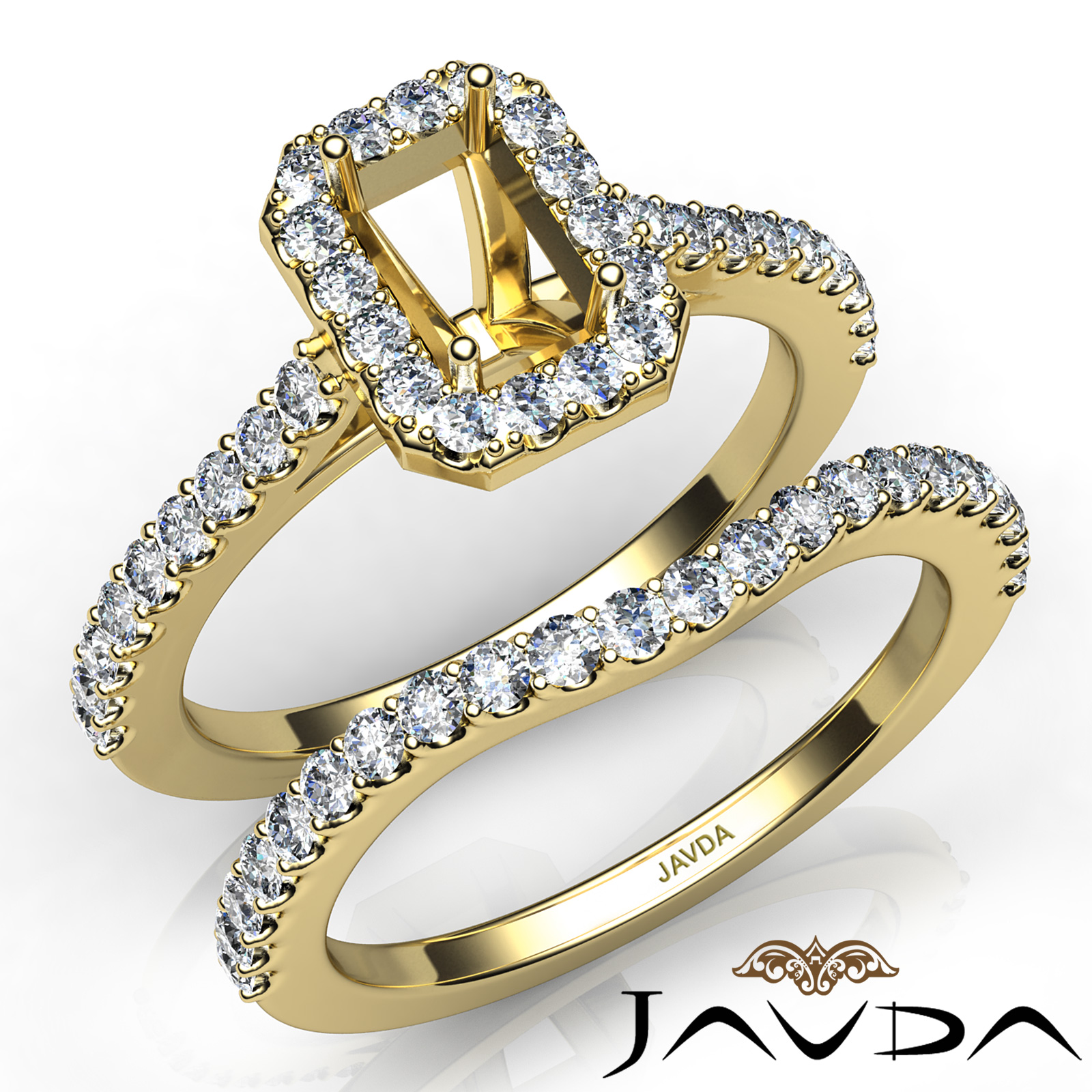 Create a breathtaking moment with this emerald semi mount . bridal set, showcasing a diamond-laden shank and halo in U prong setting, with a matching band. This engagement ring is framed against enduring 14k Gold Yellow. (1Ct. tw.)