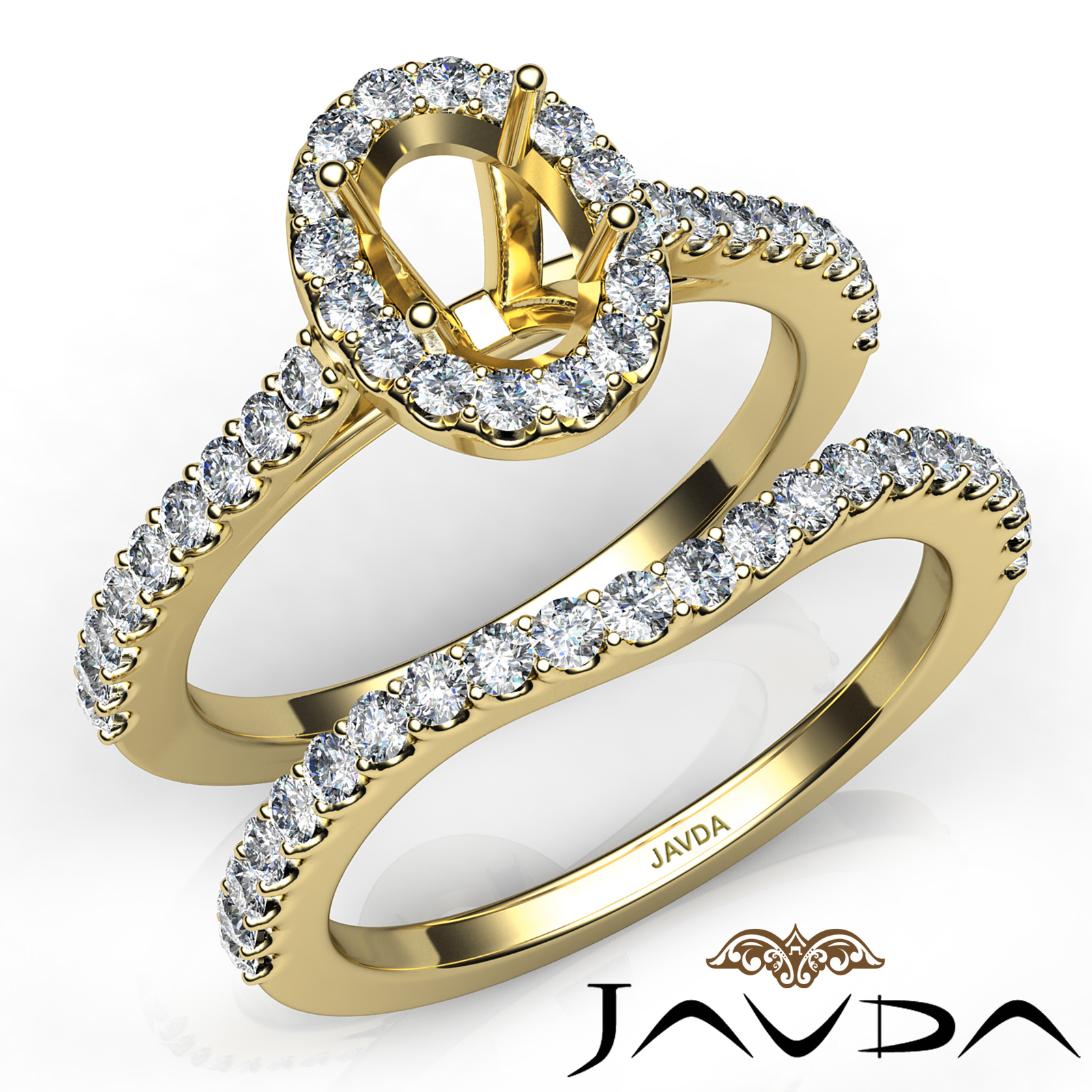 Create a breathtaking moment with this oval semi mount . bridal set, showcasing a diamond-laden shank and halo in U prong setting, with a matching band. This engagement ring is framed against enduring 18k Gold Yellow. (1Ct. tw.)