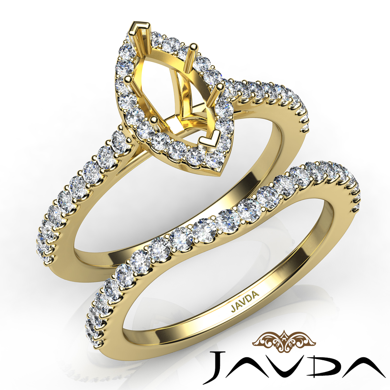 Create a breathtaking moment with this marquise cut semi mount . bridal set, showcasing a diamond-laden shank and halo in U prong setting, with a matching band. This engagement ring is framed against enduring 14k Gold Yellow. (1Ct. tw.)