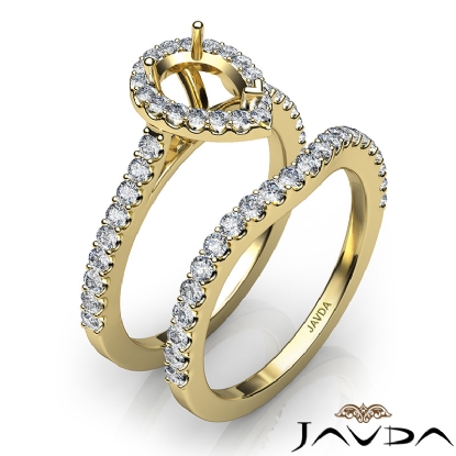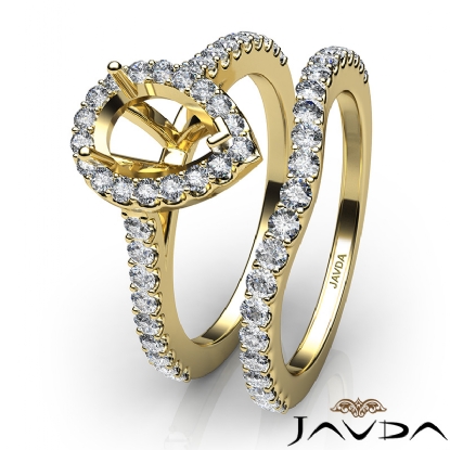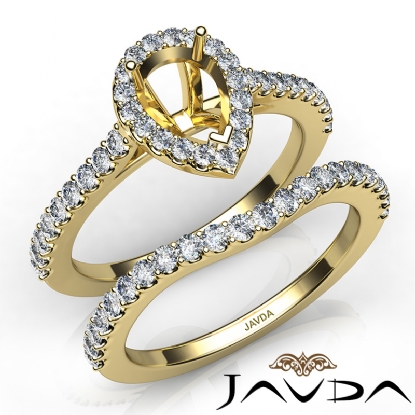 Create a breathtaking moment with this pear cut semi mount . bridal set, showcasing a diamond-laden shank and halo in U prong setting, with a matching band. This engagement ring is framed against enduring 14k Gold Yellow. (1Ct. tw.)