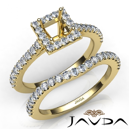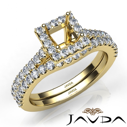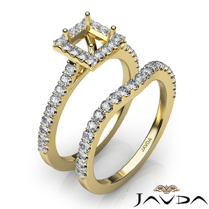 Create a breathtaking moment with this princess cut semi mount . bridal set, showcasing a diamond-laden shank and halo in U prong setting, with a matching band. This engagement ring is framed against enduring 14k Gold Yellow. (1Ct. tw.)