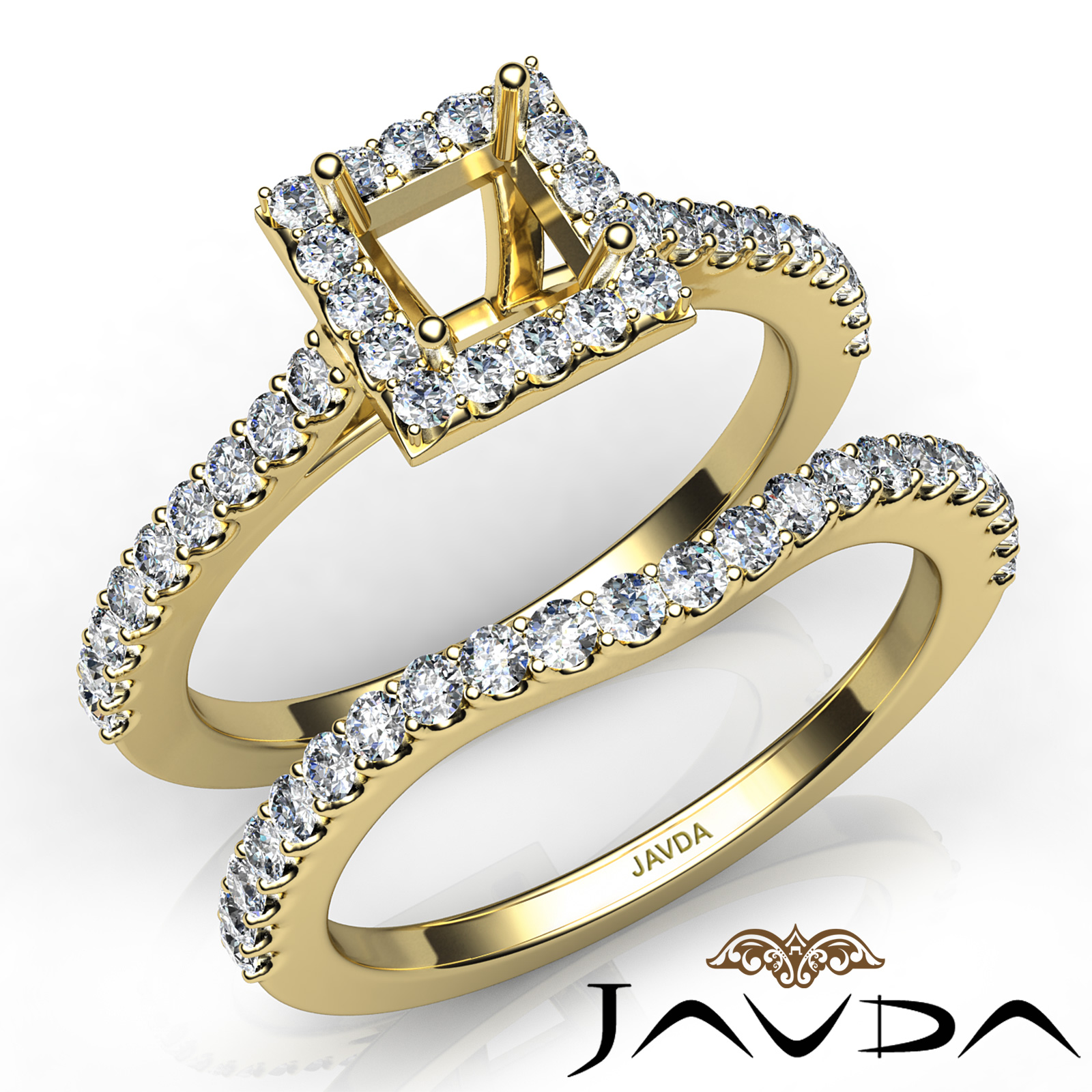 Create a breathtaking moment with this princess cut semi mount . bridal set, showcasing a diamond-laden shank and halo in U prong setting, with a matching band. This engagement ring is framed against enduring 18k Gold Yellow. (1Ct. tw.)