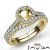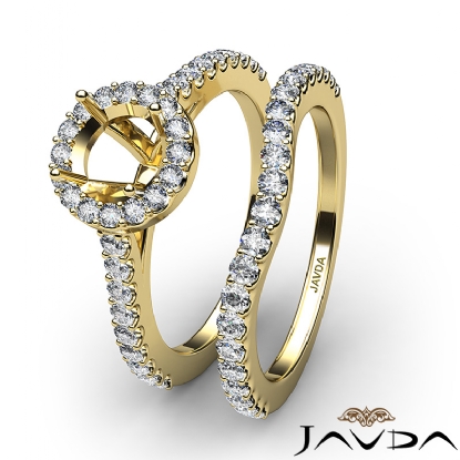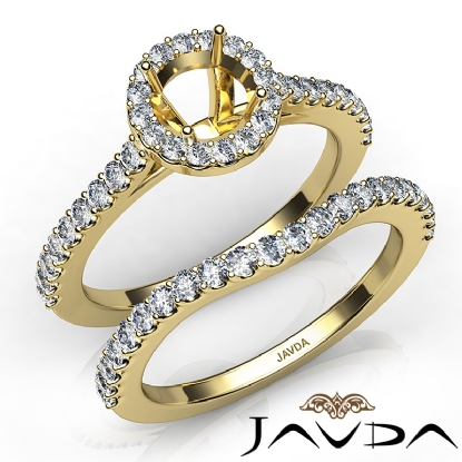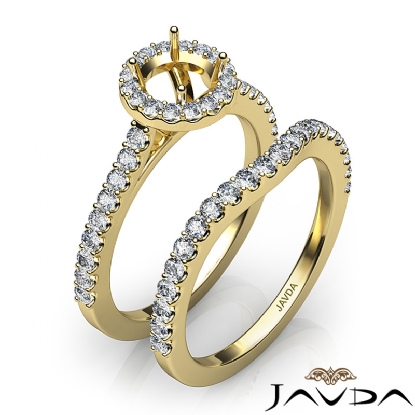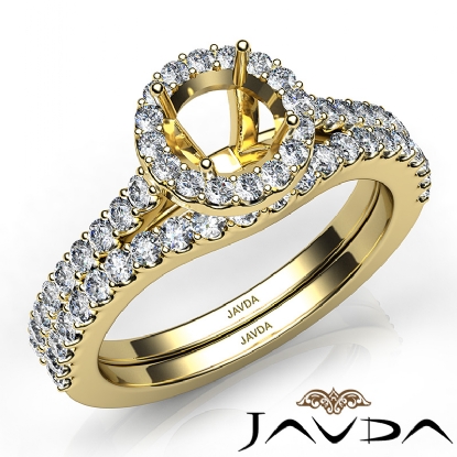 Create a breathtaking moment with this round cut semi mount . bridal set, showcasing a diamond-laden shank and halo in U prong setting, with a matching band. This engagement ring is framed against enduring 18k Gold Yellow. (1Ct. tw.)