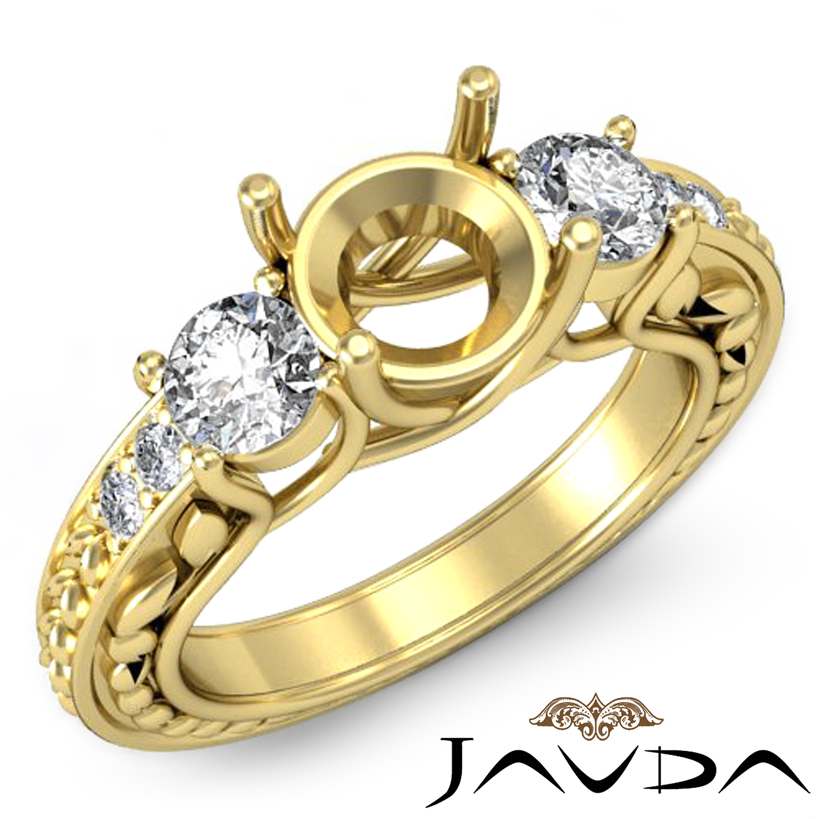 Beautifully set round diamonds in prong setting in this semi mount three stone diamond ring look ecstatic. Smaller round diamonds and leaf motifs that highlight the ring look unique. This ring is made in 18k Gold Yellow. (0.45Ct. tw.)