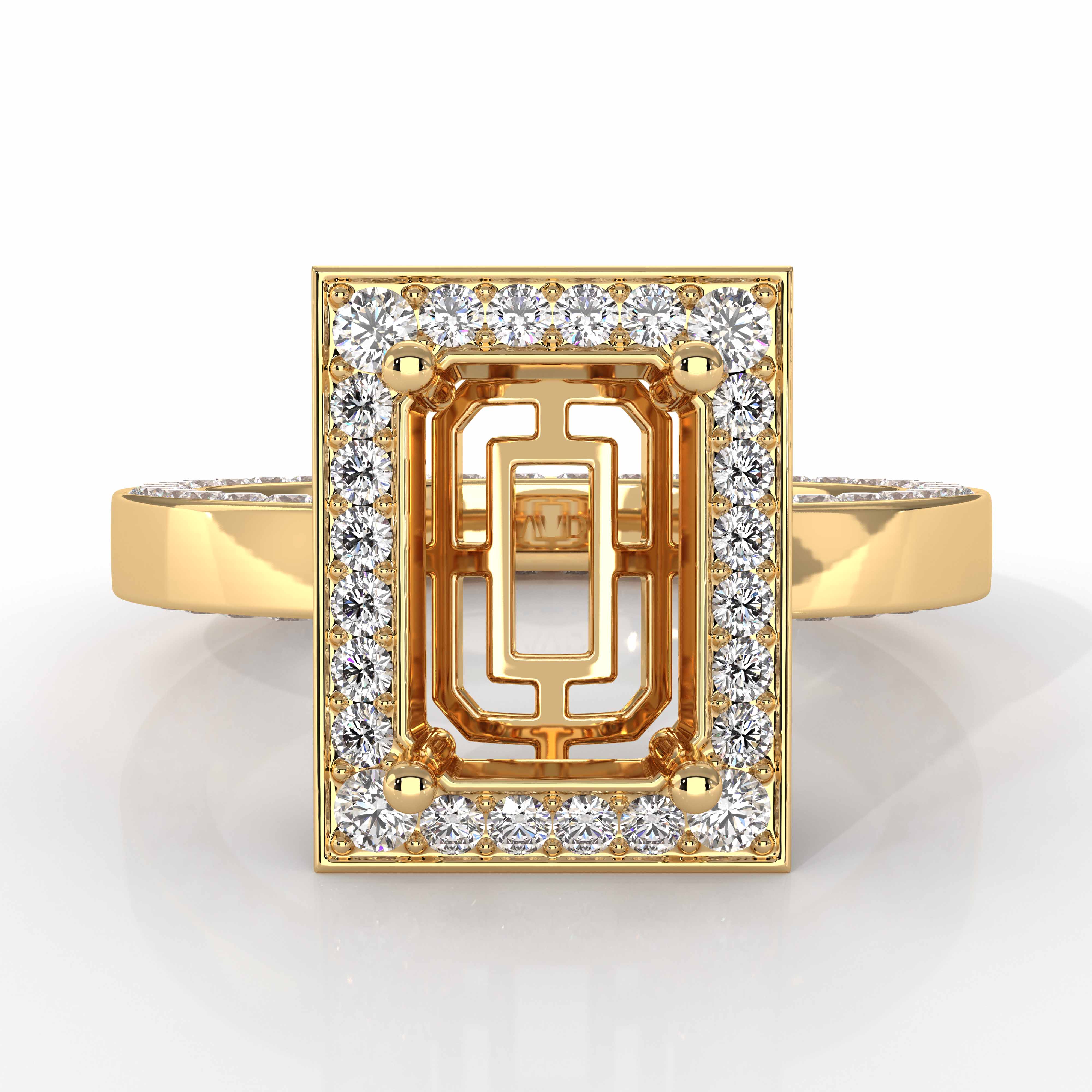 Forever timeless, this luxurious 18k Gold Yellow engagement ring has an emerald semi mount. It showcases round pave diamonds in halo & along the shank. (1.4Ct. tw.)