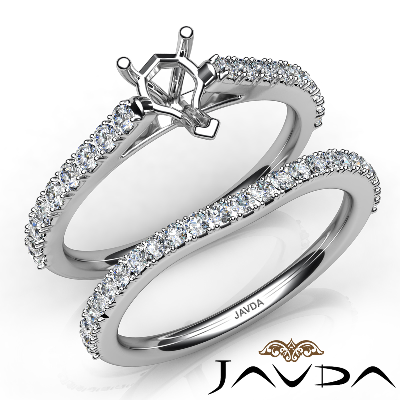 Get mesmerized with this pear cut semi mount . bridal set, showcasing a diamond-laden V split Prong setting in shank, with a matching band. This engagement ring is framed against enduring 18k Gold White. (0.8Ct. tw.)