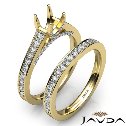 Elegant! This . cushion cut semi mount engagement ring and matching band feature round pave set diamonds along the shank. Made in 18k Gold Yellow, this bridal set is mesmerising! (1.25Ct. tw.)