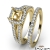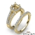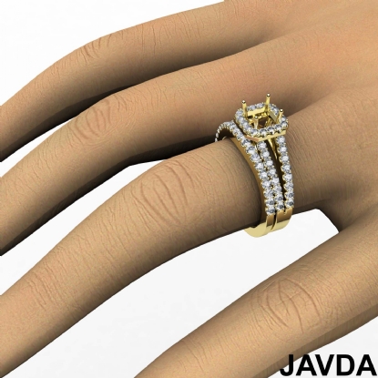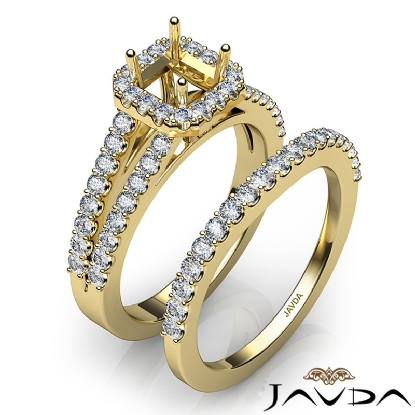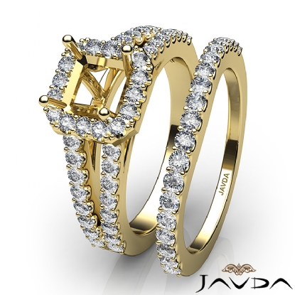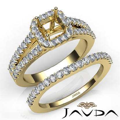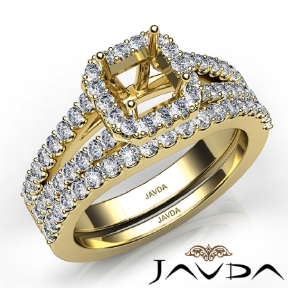 Capture your lasting love with this 18k Gold Yellow asscher semi mount bridal set showcasing a U Cut Prong set diamonds in halo and along the split shank. This engagement ring comes with a matching band. (1.25Ct. tw.)