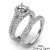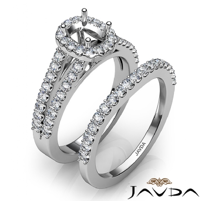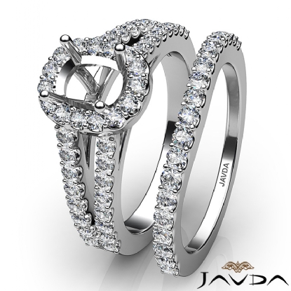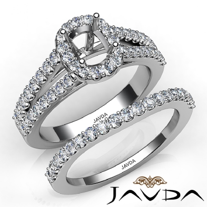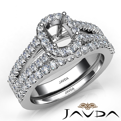 Capture your lasting love with this 18k Gold White cushion semi mount bridal set showcasing a U Cut Prong set diamonds in halo and along the split shank. This engagement ring comes with a matching band. (1.25Ct. tw.)