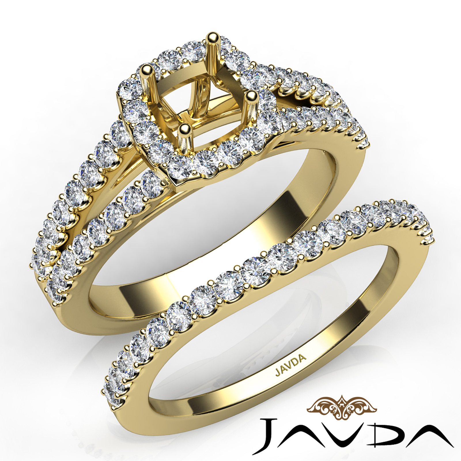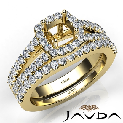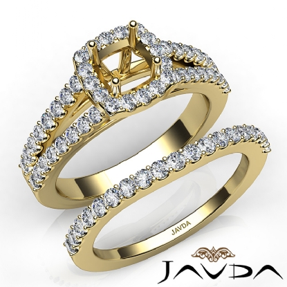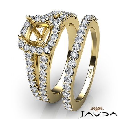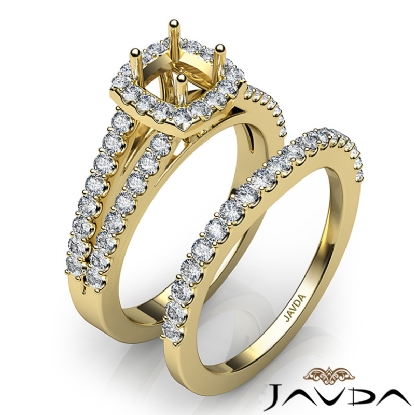 Capture your lasting love with this 18k Gold Yellow cushion cut semi mount bridal set showcasing a U Cut Prong set diamonds in halo and along the split shank. This engagement ring comes with a matching band. (1.25Ct. tw.)