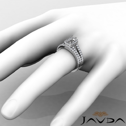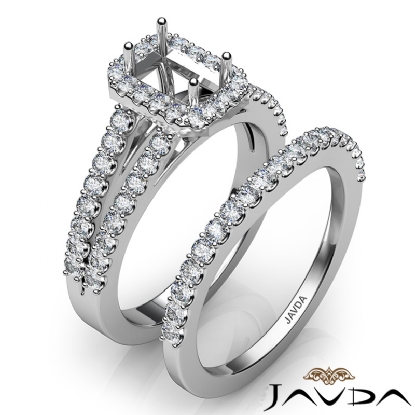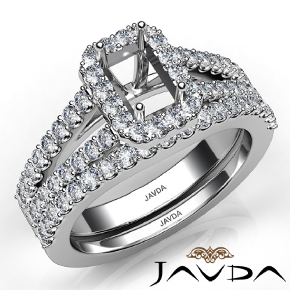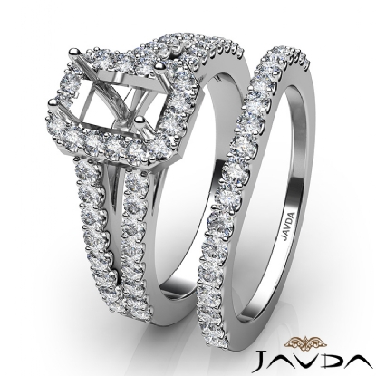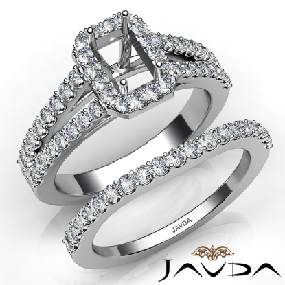 Capture your lasting love with this 18k Gold White emerald semi mount bridal set showcasing a U Cut Prong set diamonds in halo and along the split shank. This engagement ring comes with a matching band. (1.25Ct. tw.)